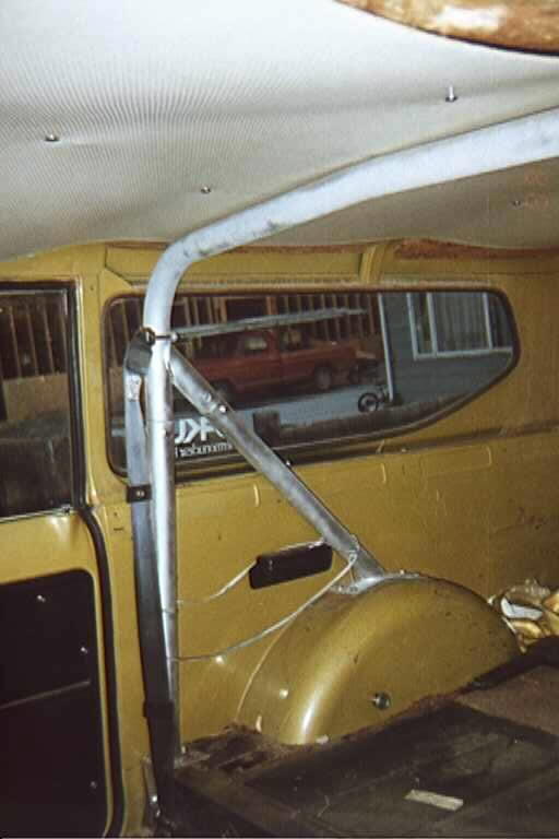 Here's one pic of my roll-bar mounted shoulder harness. The other photos didn't turn out very clear (cheap-o $35 pawn-shop Vivitar.. but, if I drop it in the mud.. who cares!). As you can also see, this shot is taken at the very beginning of my "tear-down" of the '72.. the front and rear bench seats have been removed, and I'm about ready to tear out the rollbar and then the flooring materials.
